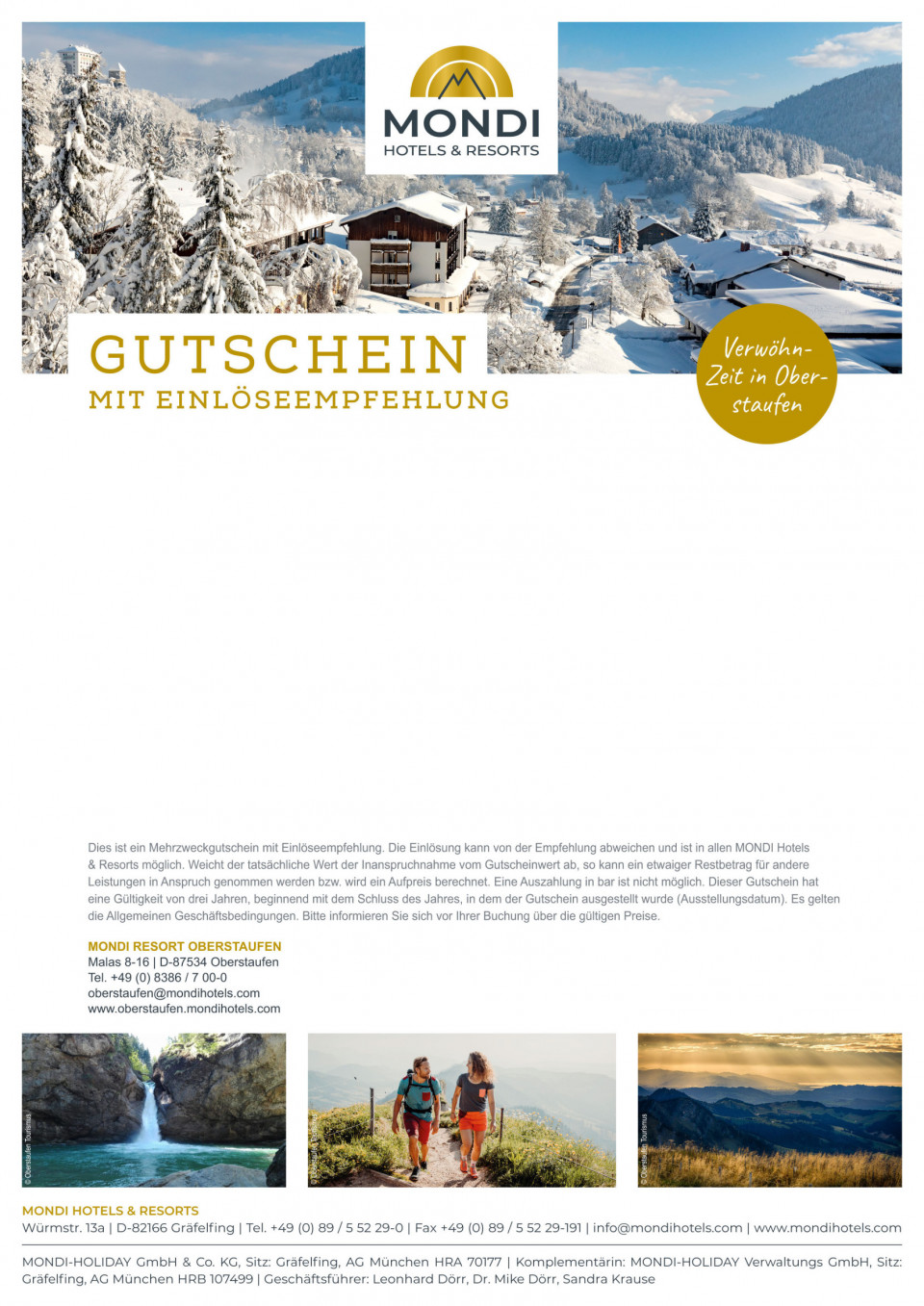 Dies ist ein Mehrzweckgutschein mit Einlöseempfehlung. Die Einlösung kann von der Empfehlung abweichen und ist in allen MONDI Hotels & Resorts möglich. Weicht der tatsächliche Wert der Inanspruchnahme vom Gutscheinwert ab, so kann ein etwaiger Restbetrag für andere Leistungen in Anspruch genommen werden bzw. wird ein Aufpreis berechnet. Eine Auszahlung in bar ist nicht möglich. Dieser Gutschein hat eine Gültigkeit von drei Jahren, beginnend mit dem Schluss des Jahres, in dem der Gutschein ausgestellt wurde (Ausstellungsdatum). Es gelten die Allgemeinen Geschäftsbedingungen. Bitte informieren Sie sich vor Ihrer Buchung über die gültigen Preise.